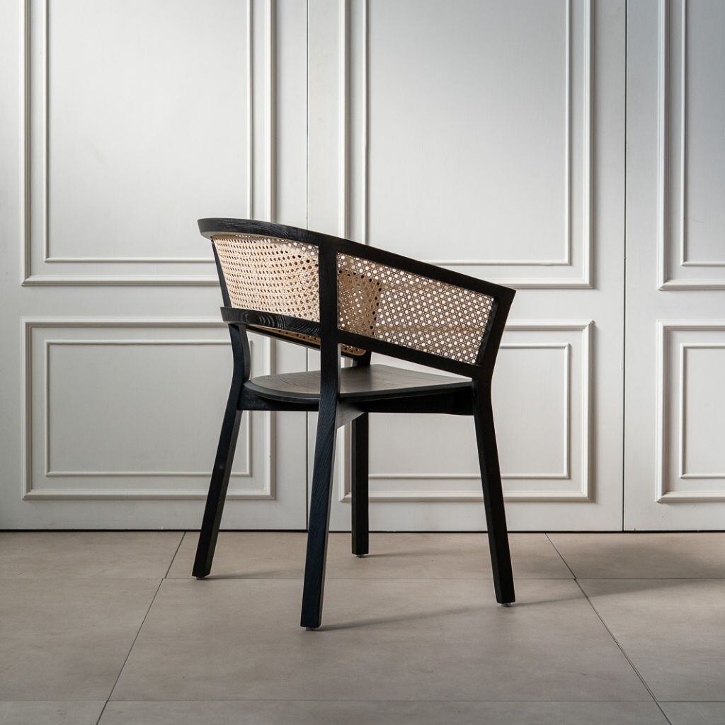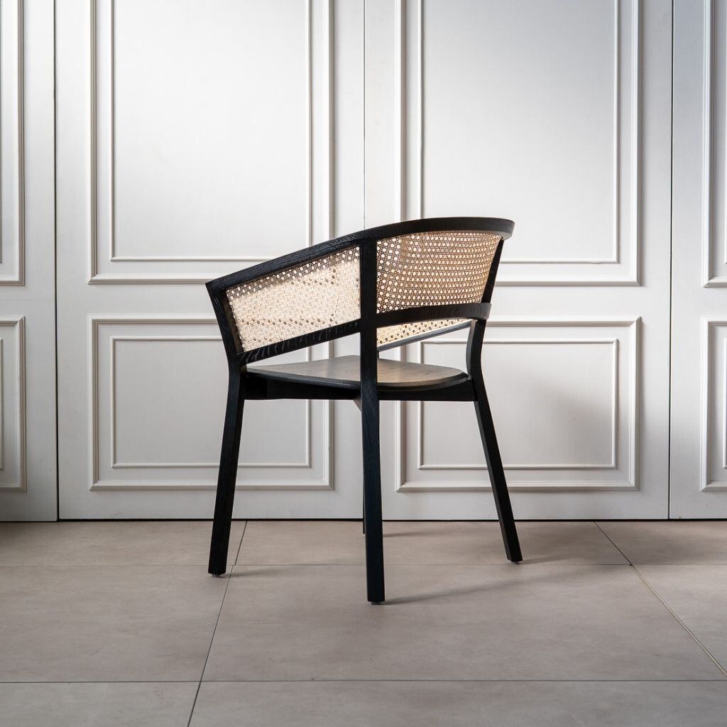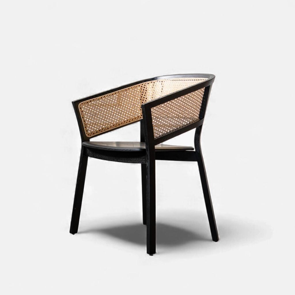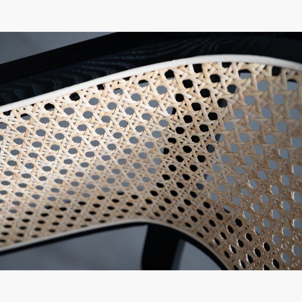 背面は丸みを帯びた美しい曲線を描き、丁寧に編み込まれたラタンと調和しながら、上質な存在感を放ちます。