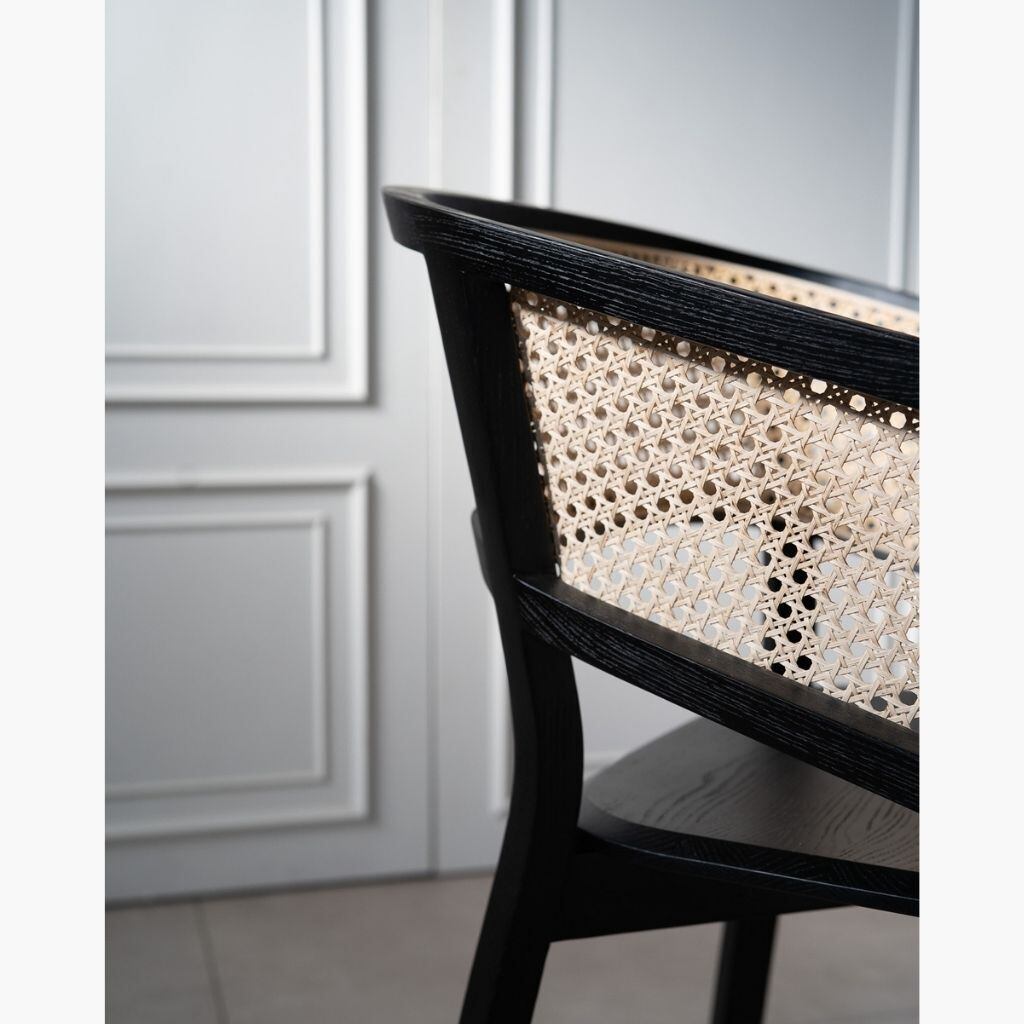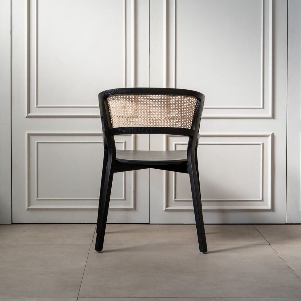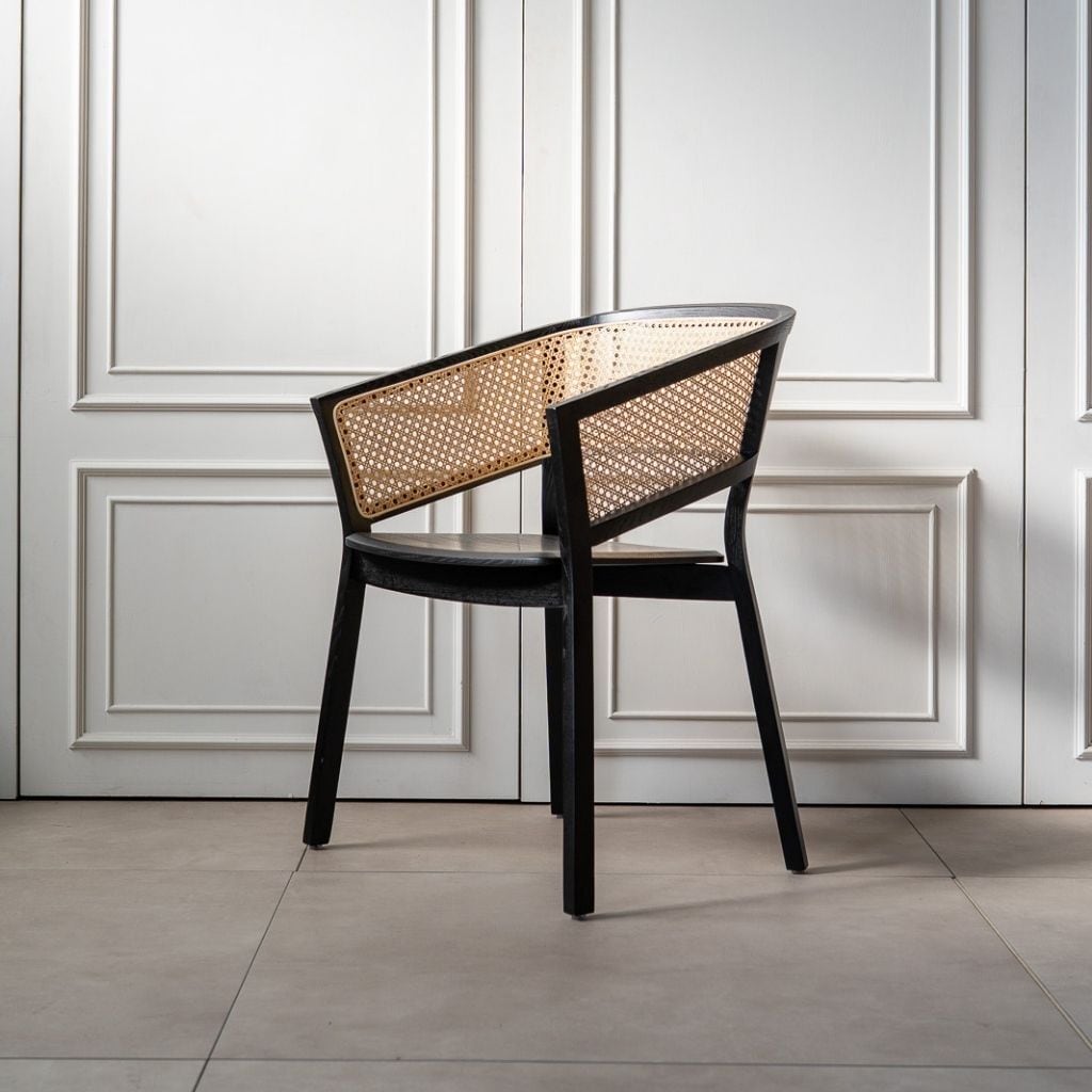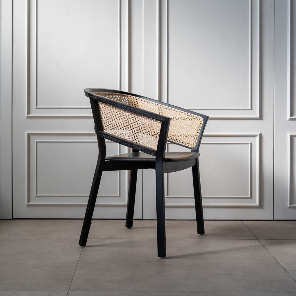 背面は丸みを帯びた美しい曲線を描き、丁寧に編み込まれたラタンと調和しながら、上質な存在感を放ちます。