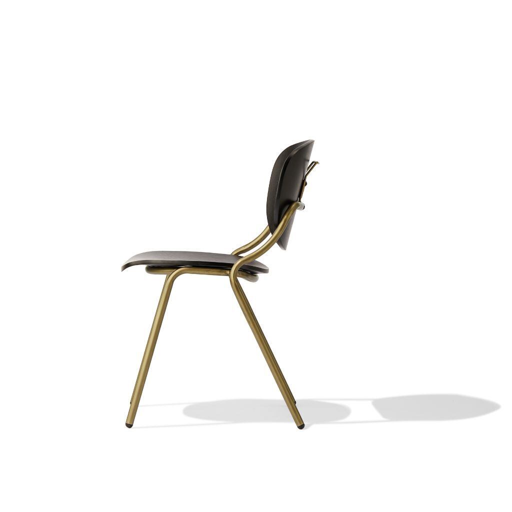 座面と背面のブラック色の成形合板と細いゴールドのフレームを合わせることで、華やかながらどこか落ち着いたバランスに仕上がっています。